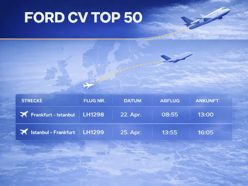herzlichen Glückwunsch zu Deiner herausragenden Leistung! Du hast Dir einen Platz beim exklusiven Event CV Top 50 in Istanbul verdient. Freue Dich auf eine faszinierende Metropole, die Tradition und Moderne auf einzigartige Weise verbindet.